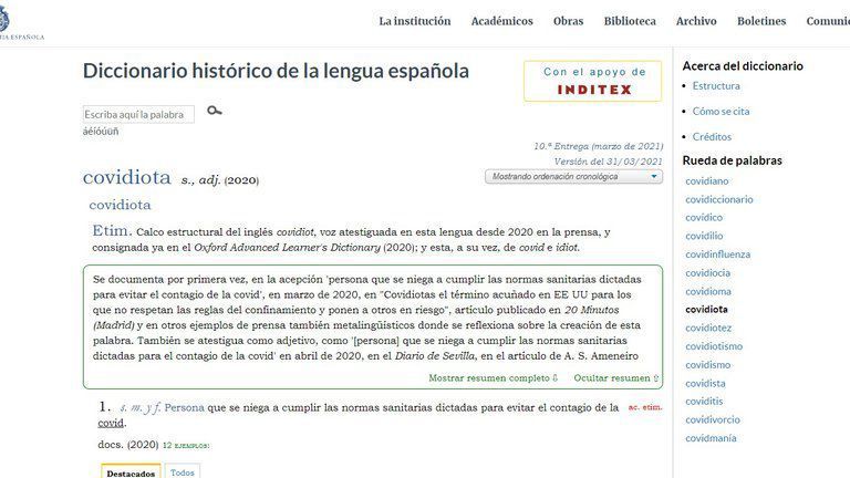 Covidiota, es la palabra más reciente que incluyó la Real Academia Española (RAE) en el diccionario. Denomina así a aquellas personas que "se niegan a cumplir las normas sanitarias dictadas para evitar el contagio de la Covid”, según publica en su página web.
