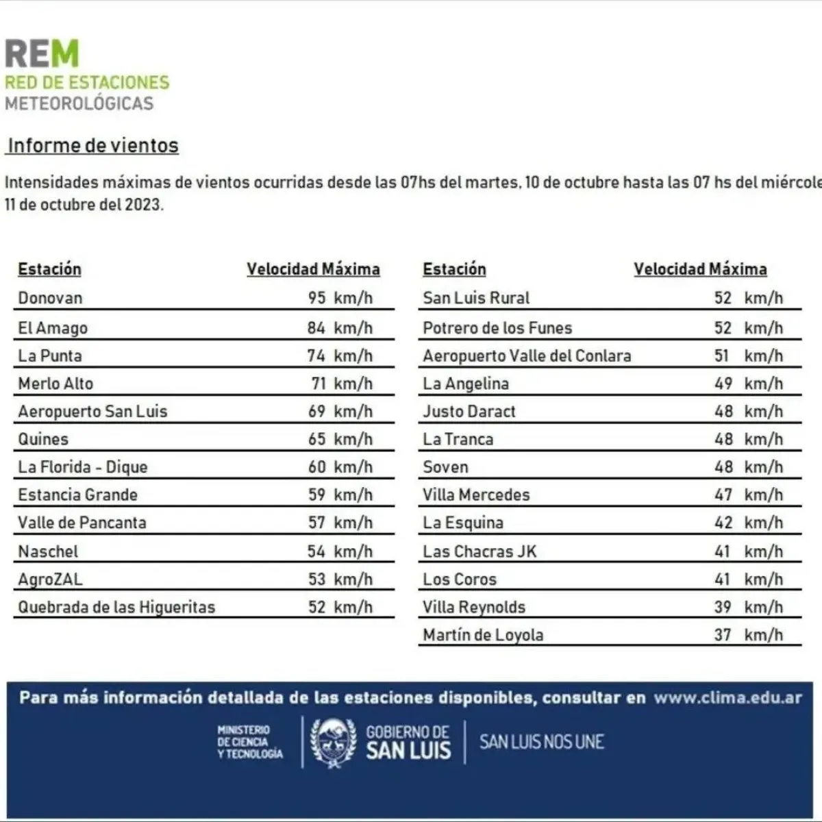 El anunciado viento en la provincia superó las ráfagas previstas en 70 kilómetros por hora. De acuerdo a los registros de la Red de Estaciones Meteorológicas (REM), alcanzó una velocidad máxima de 95 kilómetros en Donovan entre las 7 del martes y la misma hora de este miércoles.