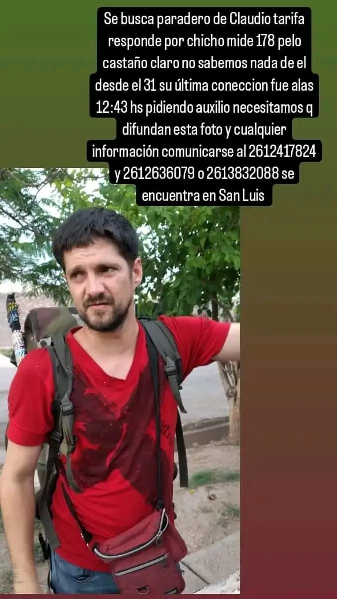 La familia Tarifa de Mendoza vive angustiada desde el domingo 31 porque no saben nada de uno de sus integrantes, Claudio (37 años), quien llegó a San Luis el sábado 30 y desde el último día del 2023 perdieron contacto con él y no saben dónde está.
