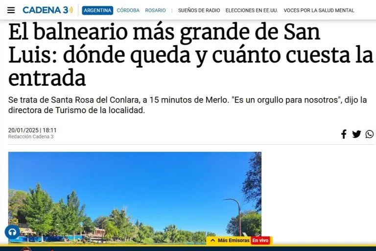 Bajo el título ‘El balneario más grande de San Luis: dónde queda y cuánto cuesta la entrada’, el medio de comunicación oriundo de Córdoba exhibió en una noticia los encantos y privilegios de Santa Rosa del Conlara, especialmente su complejo veraniego de 16 hectáreas ideal para disfrutar en familia.