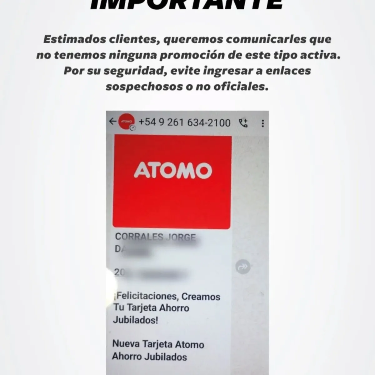 El mensaje fraudulento utiliza el logo de la cadena de supermercados e imágenes que hacen referencia a descuentos para clientes del Banco Nación (BNA+), un recurso habitual en estafas digitales para generar confianza. Átomo aclaró que no tiene vigente ninguna promoción de este tipo y pidió a los clientes verificar siempre la información en sus canales oficiales. "Estimados clientes, queremos comunicarles que no tenemos ninguna promoción de este tipo activa", señalaron en un comunicado.