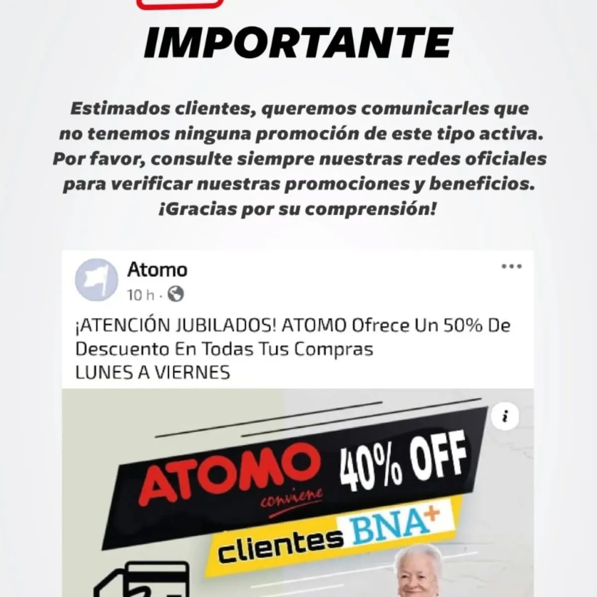 Una supuesta promoción dirigida a jubilados, que ofrece un 50% de descuento en todas las compras de lunes a viernes en el supermercado Átomo, comenzó a circular en redes sociales. Sin embargo, la cadena desmintió la información y alertó sobre posibles engaños que buscan captar a adultos mayores con ofertas falsas.