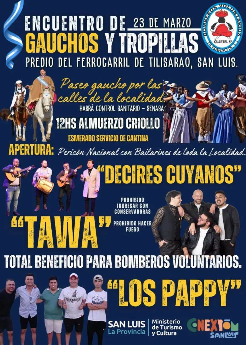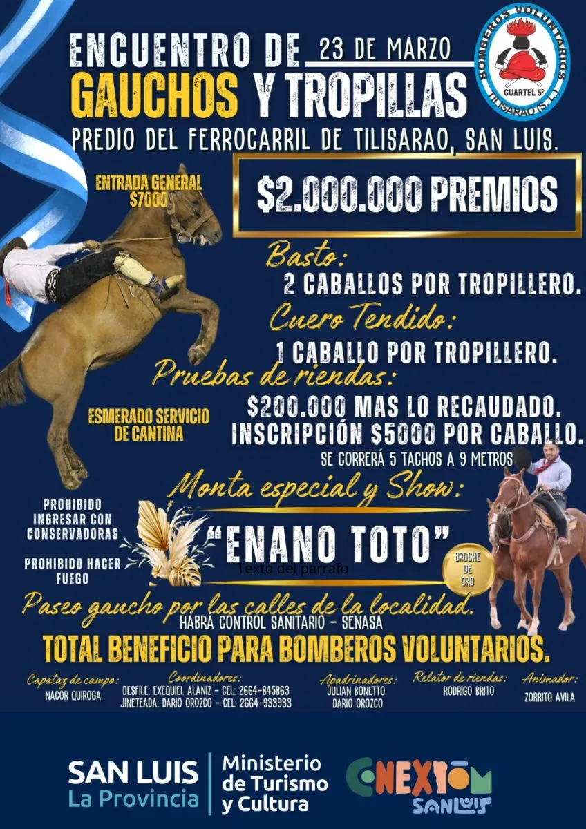Bomberos Voluntarios de Tilisarao organizan el primer Encuentro Gaucho y de Tropillas, un evento que combinará tradición, destrezas criollas y espectáculos musicales con un fin solidario: reunir los fondos necesarios para la compra y traslado de un autobomba desde Europa. La jornada se llevará a cabo el próximo 23 de marzo, a partir de las 10 de la mañana, en el predio del Ferrocarril sobre la Ruta 40.