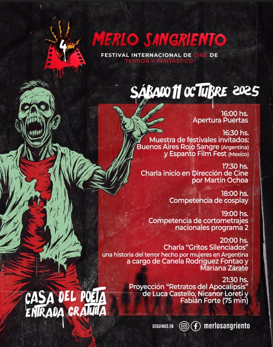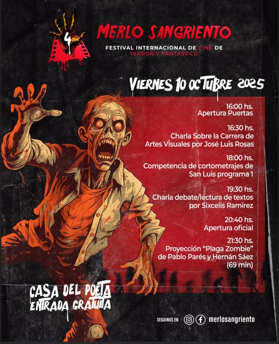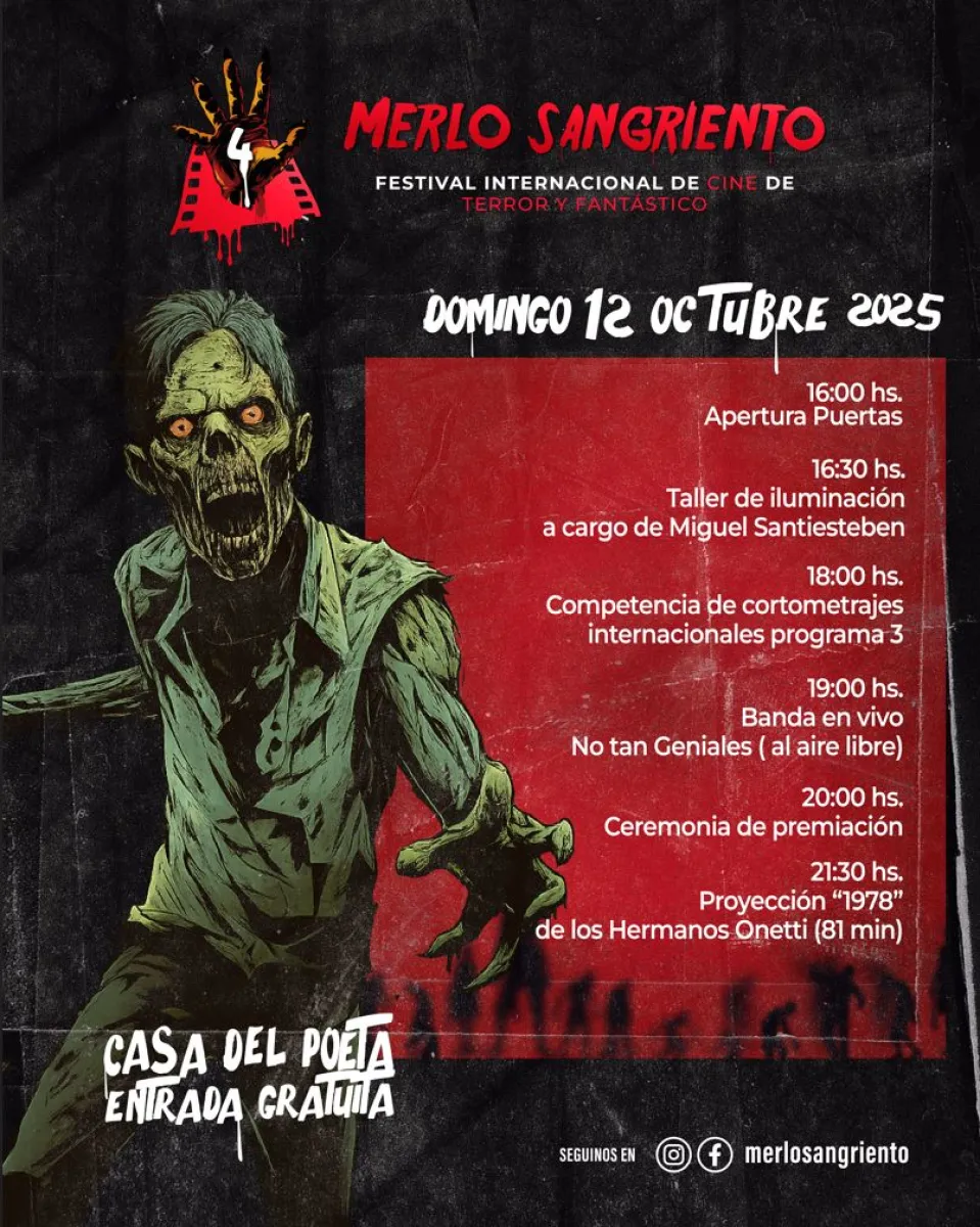 Villa de Merlo vivirá del 10 al 12 de octubre la cuarta edición del Festival Internacional de Cine de Terror y Fantástico “Merlo Sangriento”. Con entrada libre y gratuita, la Casa del Poeta ofrecerá cortometrajes regionales, nacionales e internacionales, charlas sobre dirección y artes visuales, talleres de iluminación, competencias de cosplay y música en vivo.