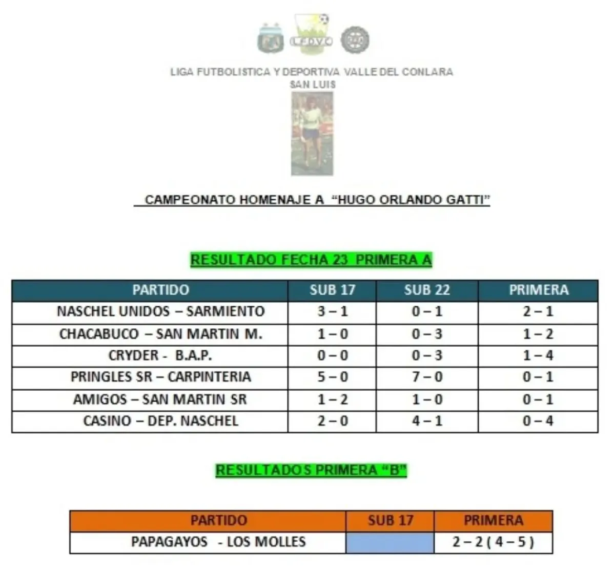 En otros resultados: San Martín de Santa Rosa superó 1 a 0 a Amigos de Tilisarao; BAP goleó 4 a 1 a Cryder; Casino cayó de local 4 a 0 ante Deportivo Naschel; y Juventud de Carpintería se impuso 1 a 0 sobre Pringles de Santa Rosa.