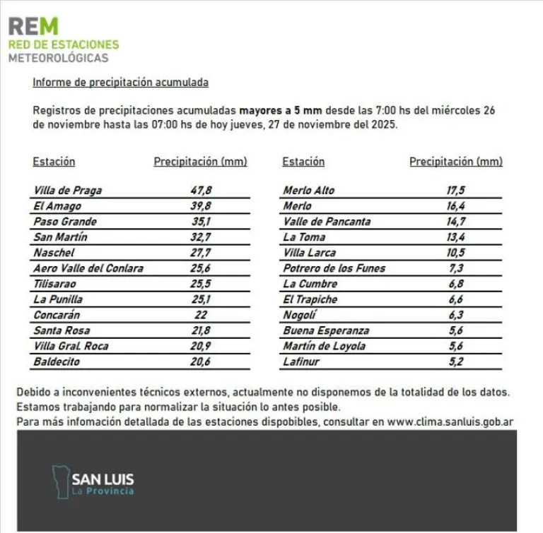 Desde el organismo aclararon que, debido a inconvenientes técnicos, no se cuenta con la totalidad de los datos de la red de estaciones, aunque trabajan para normalizar la situación a la brevedad. Para más información, la REM recomienda consultar sus reportes actualizados.