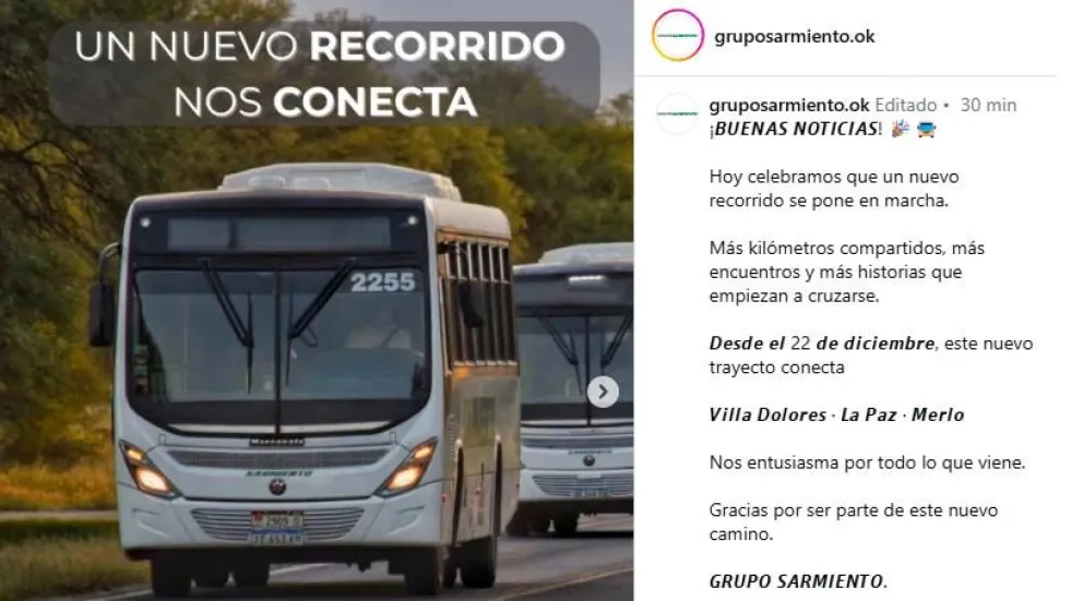 El anuncio fue realizado por el Grupo Sarmiento a través de sus redes sociales, donde expresaron: “Hoy celebramos que un nuevo recorrido se pone en marcha. Más kilómetros compartidos, más encuentros y más historias que empiezan a cruzarse”. En el mismo mensaje, precisaron que “desde el 22 de diciembre, este nuevo trayecto conecta Villa Dolores, La Paz y Merlo”, y destacaron su expectativa por esta nueva etapa.