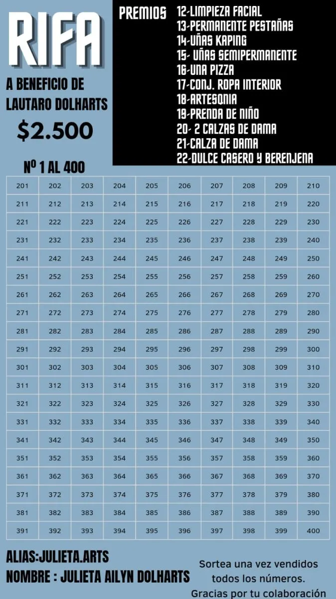 Además, en paralelo, se realiza una rifa solidaria, con 400 números a 2.500 pesos cada uno y más de 20 premios. El sorteo se realizará una vez vendidos todos los números. Para ayudar, hay que comunicarse a este contacto: 2664 93-1658.
