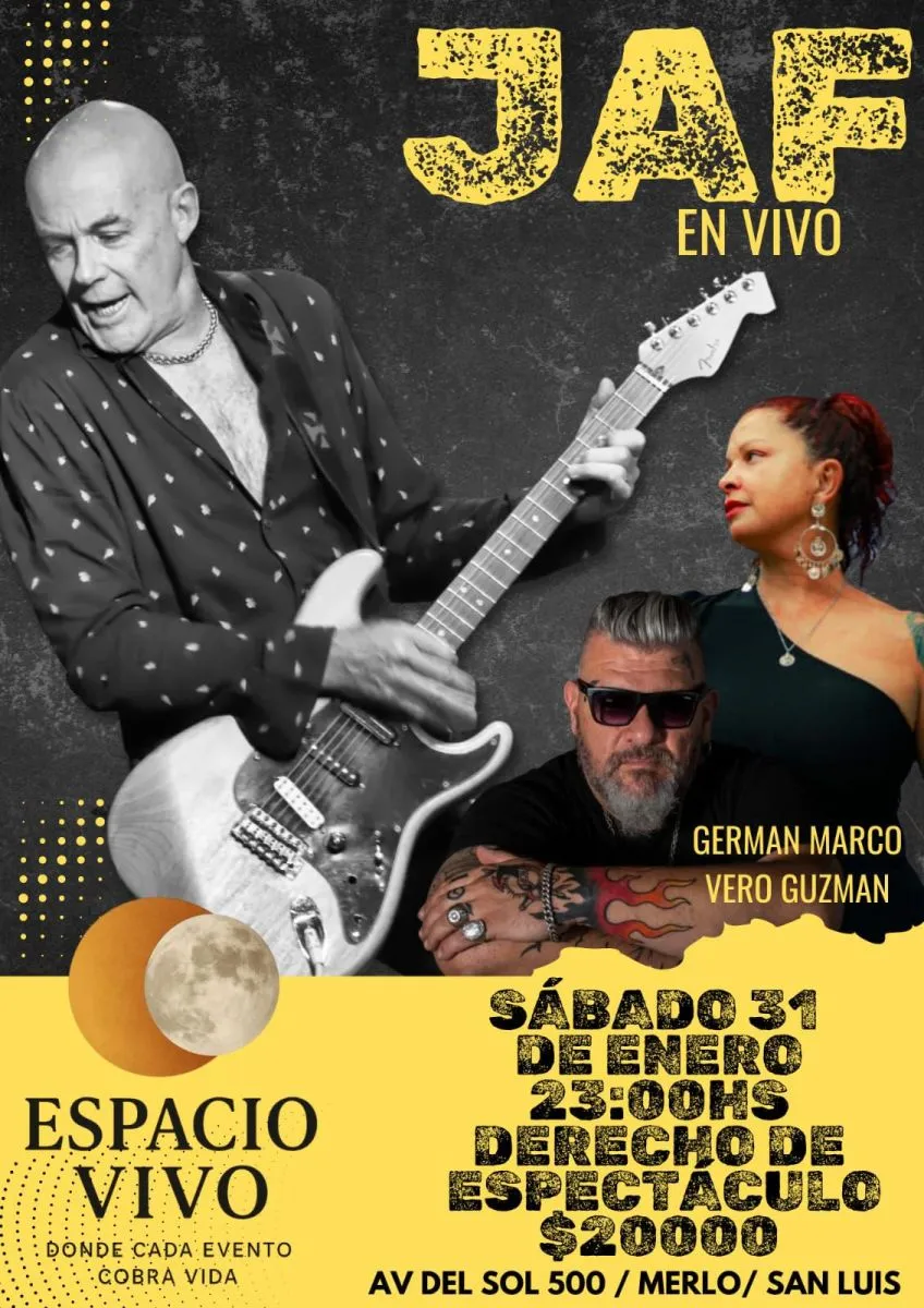Este sábado 31 de enero, desde las 23 horas, Merlo vivirá una jornada especial con la llegada de JAF, el reconocido músico que lleva más de medio siglo de trayectoria. El concierto se realizará en Avenida del Sol 500, en el nuevo teatro “Espacio Vivo”, un lugar pensado para que cada evento cobre vida.