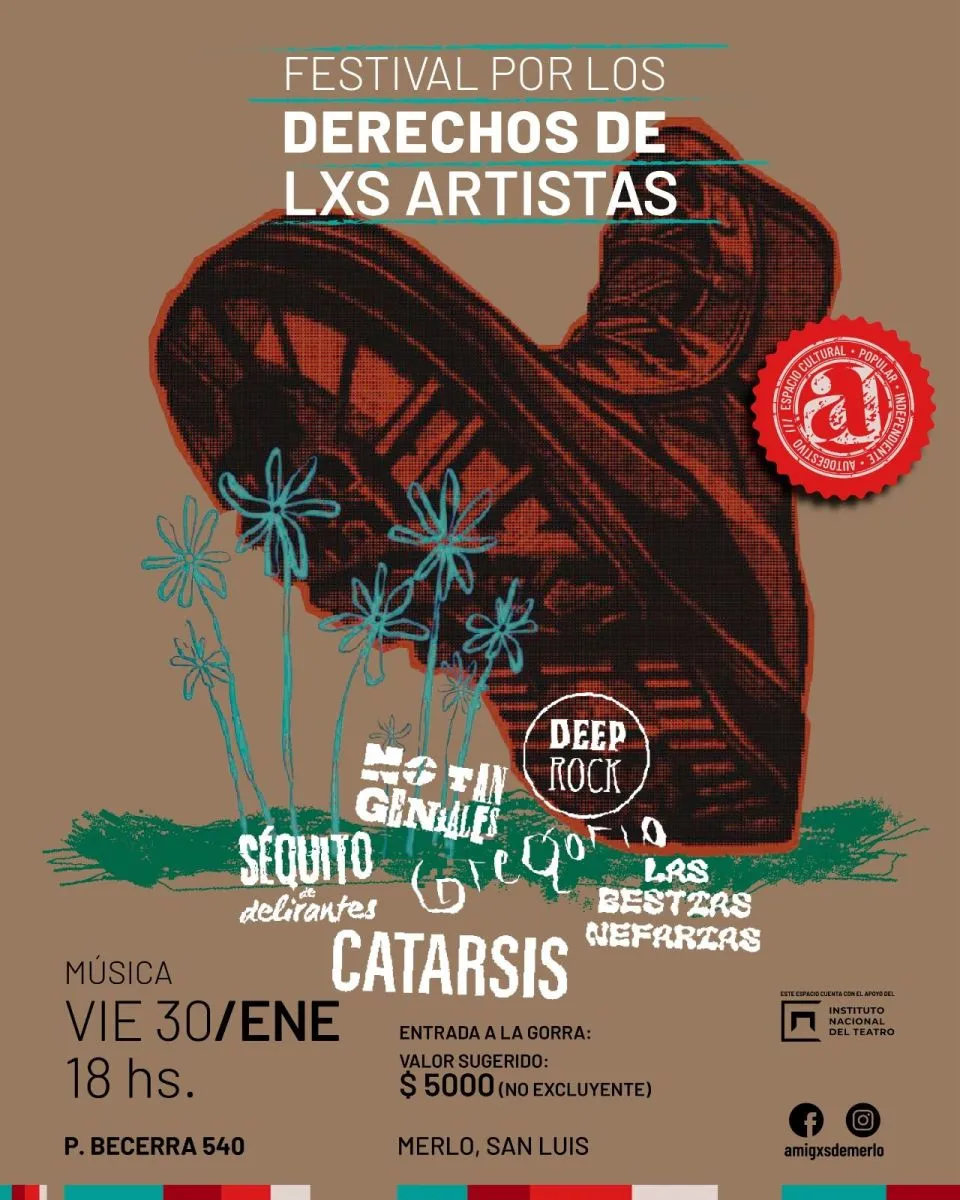 El “Festival por los Derechos de lxs Artistas” se realizará este viernes 30 de enero, desde las 18 horas, en el patio del Espacio Cultural Amigxs de Merlo, con la participación de Catarsis, Deep Rock, No Tan Geniales, Las Bestias Nefarias, Séquito de Delirantes y Gregorio. El evento es apto para todo público y contará con música en vivo desde el atardecer.