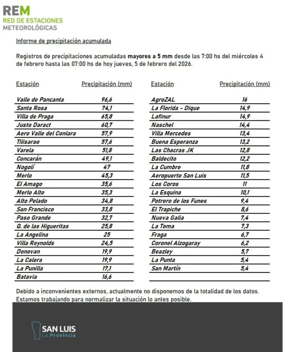 En el valle del Conlara, las precipitaciones también fueron significativas: Santa Rosa del Conlara acumuló 74,1 mm, y el Aeropuerto 57,9 mm, ubicándose entre los mayores registros de la provincia. El máximo relevado fue en Valle de Pancanta, con 96,6 mm.