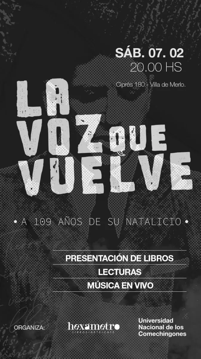 En el marco del 109° aniversario del nacimiento del máximo poeta de San Luis, la librería Hexámetro y la Universidad Nacional de los Comechingones (UNLC) invitan a la comunidad a "La voz que vuelve", un evento cultural que propone redescubrir la vigencia de Antonio Esteban Agüero a través de la música, la palabra y el legado Agüeriano.