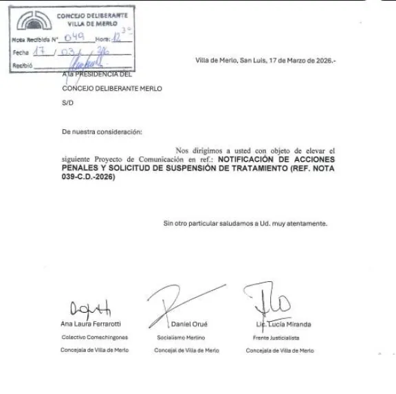 La situación política en Villa de Merlo atraviesa un momento crítico luego de que concejales de la oposición formalizaran una nueva denuncia penal. Esta vez, vinculada a la sesión preparatoria realizada el pasado 4 de febrero. Los ediles Daniel Orué, Ana Laura Ferrarotti y Lucía Miranda sostienen que dicho encuentro fue convocado y desarrollado en abierta contradicción con el Reglamento Interno, calificándolo como “manifiestamente inconstitucional” y “nulo de nulidad absoluta”.