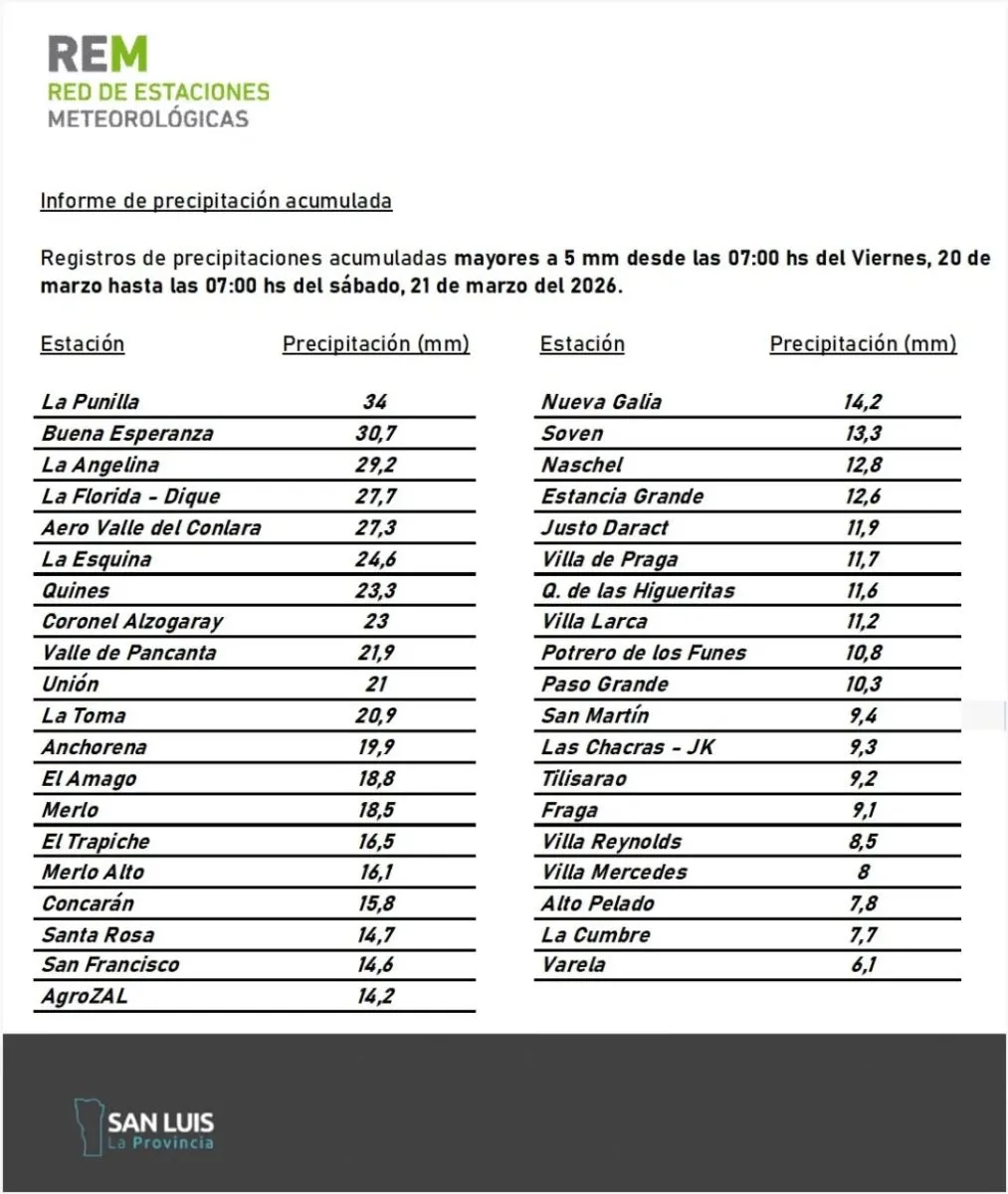 De acuerdo al relevamiento de la REM, los mayores registros de precipitaciones entre el viernes 20 y la mañana del sábado 21 de marzo se dieron en La Punilla (34 mm), Buena Esperanza (30,7 mm) y La Angelina (29,2 mm). En tanto, en el Valle del Conlara también se reportaron valores importantes: la parte baja de Villa de Merlo acumuló 18,5 mm, mientras que localidades cercanas como Santa Rosa alcanzaron 14,7 mm y Concarán 15,8 mm.