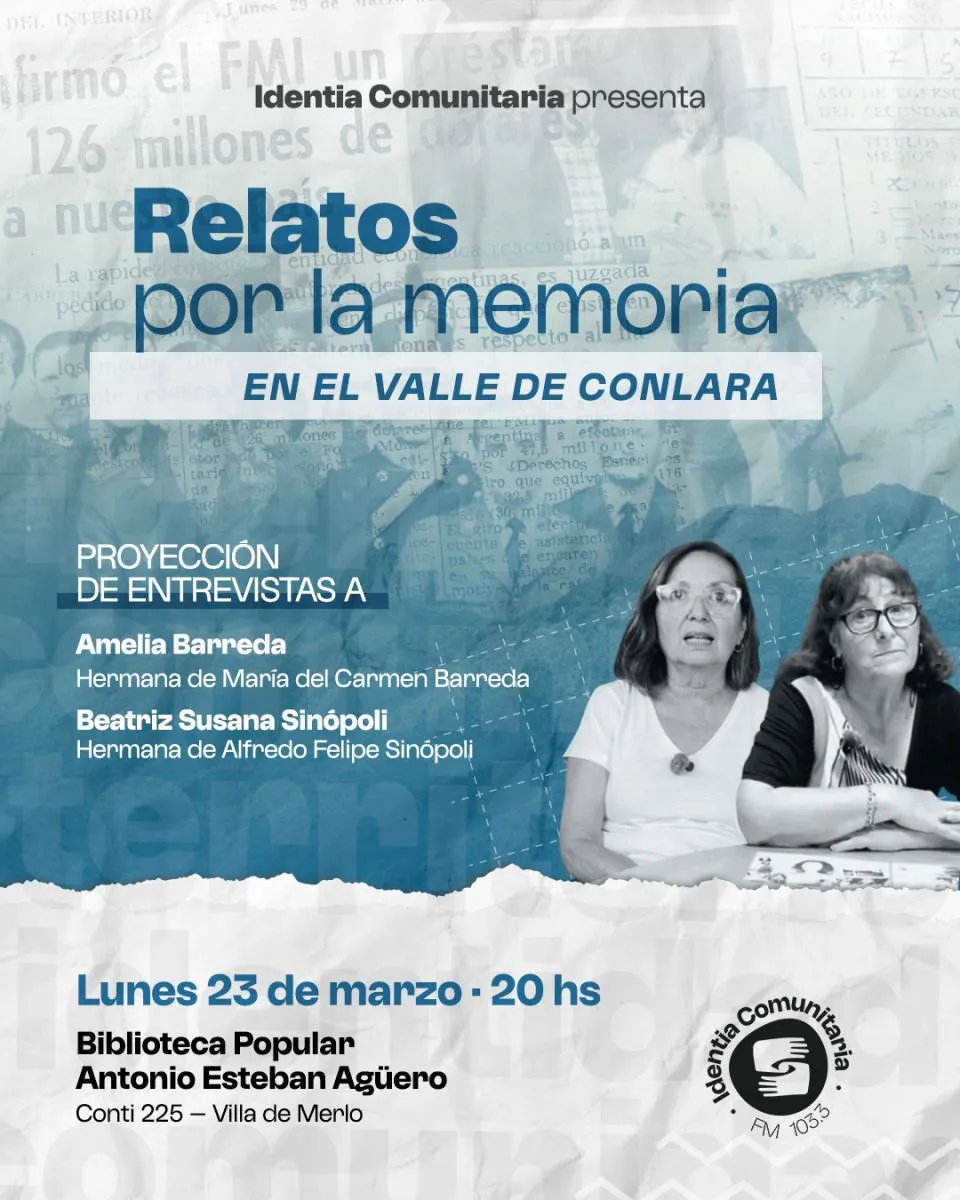 A 50 años del golpe de Estado, las historias de la región vuelven a tomar la palabra. Este lunes 23, en la previa del 24 de marzo, se realizará en Villa de Merlo la actividad “Relatos por la memoria en el Valle del Conlara”, con la proyección de documentales y la participación de familiares de víctimas del terrorismo de Estado.