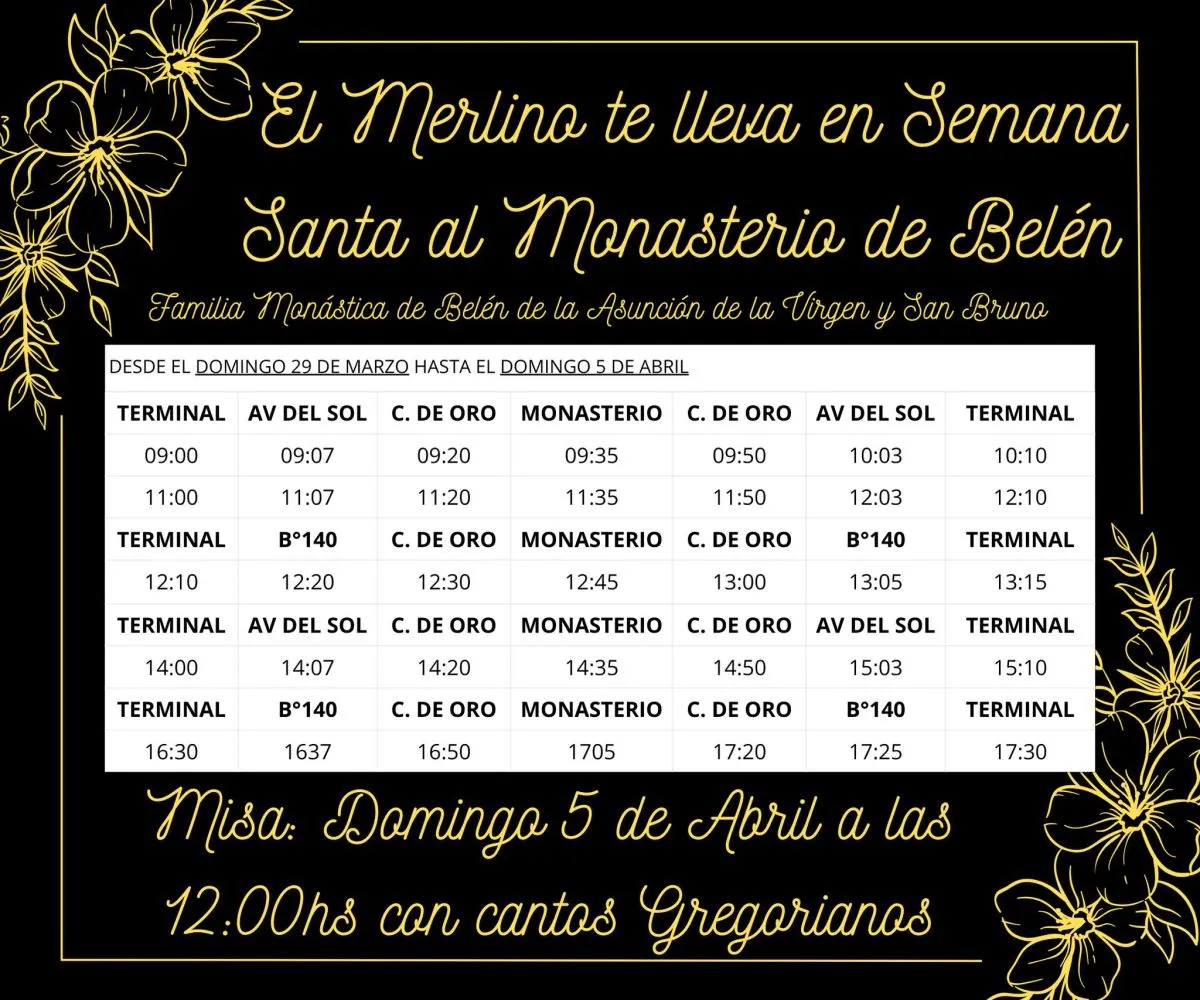 Asimismo, se informó que hasta el domingo 5 de abril estará vigente un servicio especial hacia el Monasterio de Belén, ubicado en el límite con Carpintería, con el objetivo de facilitar el acceso de fieles y visitantes que participan de las actividades religiosas características de estas fechas.