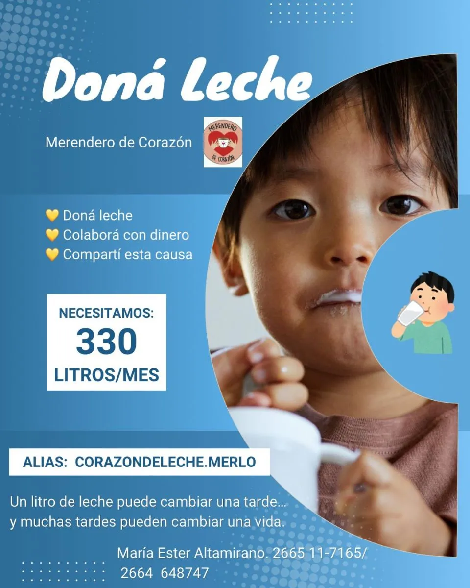 Quienes deseen ayudar pueden hacerlo a través del alias corazondeleche.merlo, con aportes destinados exclusivamente a la compra de este alimento.