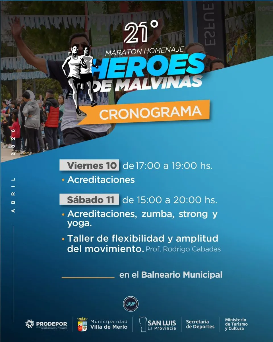 La Maratón Homenaje a los Héroes de Malvinas celebrará este domingo 12 su 21° edición en la Villa de Merlo. Para brindar detalles, el director de Deporte Comunitario de la secretaría de Deportes, Pedro Nadal, y el secretario de Gobierno y Deportes de la municipalidad de Merlo, Francisco Oviedo, ofrecieron una conferencia de prensa en Casa de Gobierno en la que, además, presentaron la remera de la carrera.